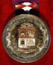 Perhaps the most intriguing of Glencairn's medallions has neither an eagle nor a lion as the crest. It also has the greatest number of design variations from the present-day version of the seal. There is an old leather jewelry case in the Museum's New Church collection that fits this medallion but not the other two. The cloth lining the case is very similar in color to the ribbon attached to the medallion (royal purple). Inside the lid of the case is printed "R. M. Johnson & Son, Masonic Jewelers, 67 Washington St. Chicago." It seems safe to assume that this is the jeweler who produced the medallion.