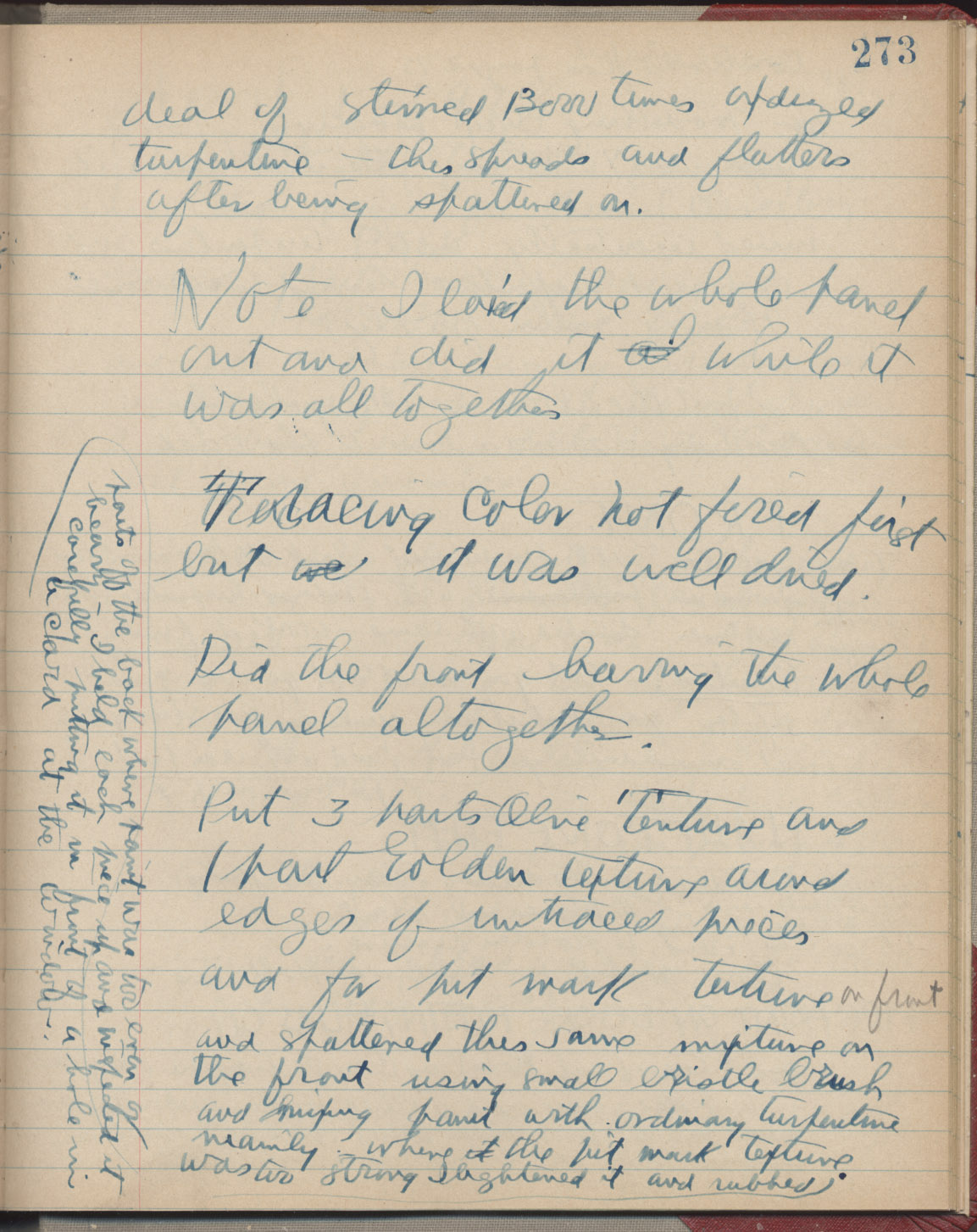 deal of stirred 13000 times oxidized turpentine – this spreads and flattens after being spattered on. Note I laid the whole panel out and did it while it was all together <left margin note for 2/3 of page: “parts of the back where paint was too even or heavy – I held each piece up and inspected it carefully putting it in front of a hole in a card at the window.”> Tracing color not fired first but it was well dried. Did the front having the whole panel altogether. Put 3 parts Olive texture and 1 part Golden texture around edges of untraced pieces and for pit mark texture on front and spattered this same mixture on the front using small bristle brush and mixing paint with ordinary turpentine mainly where the pit mark texture was too strong I lightened it and rubbed. |