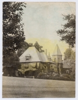 Mildred Glenn (later became Mildred Pitcairn) posing in blue velvet dress by Cairnwood balustrade